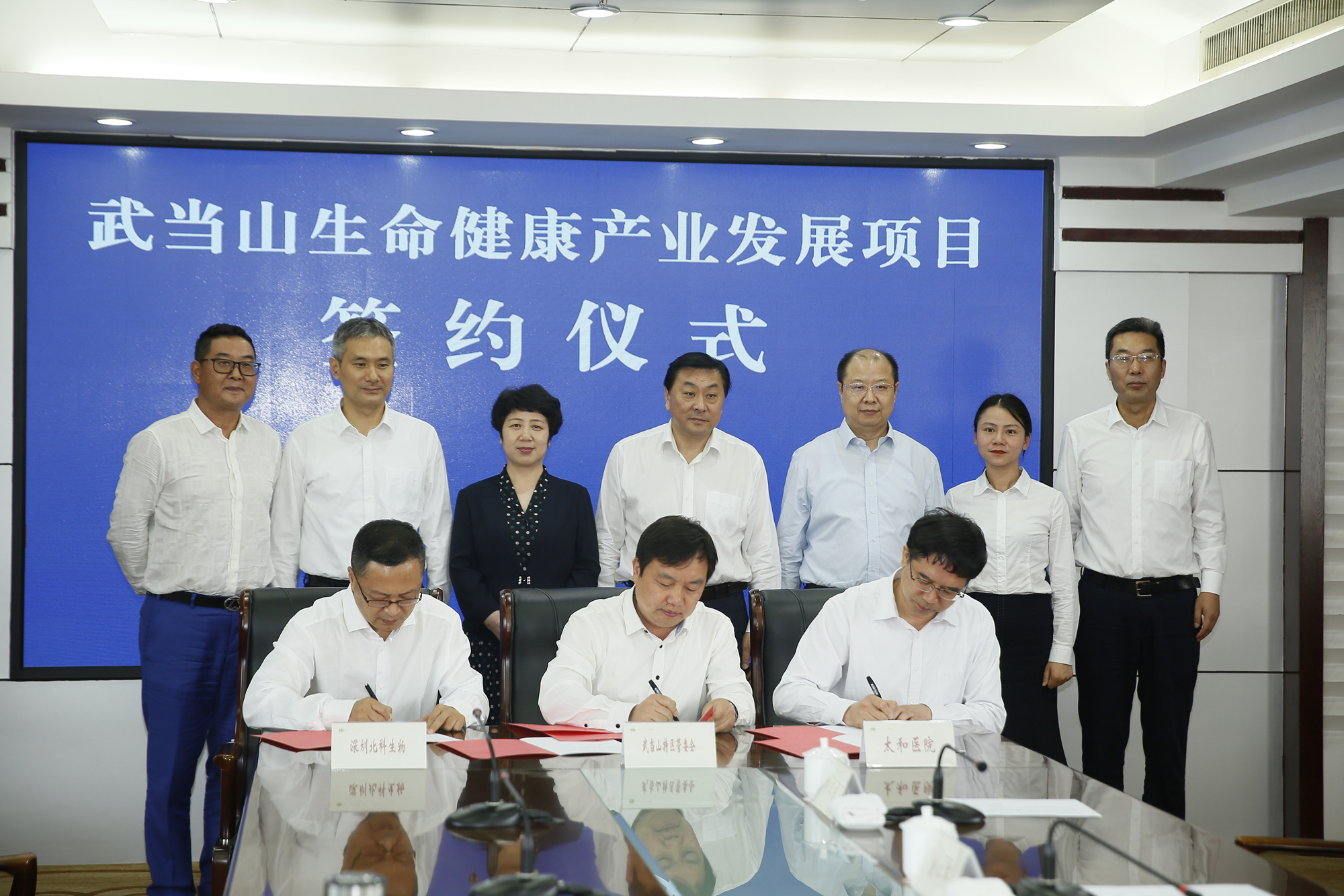 簽約儀式現(xiàn)場(chǎng),深圳市北科生物科技有限公司、特區(qū)管委會(huì)、太和醫(yī)院代表三方共同簽訂了協(xié)議。北科生物科技有限公司與太和健康投資管理有限責(zé)任公司簽訂了協(xié)議。